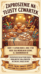 Zarząd UTW oraz Rada Słuchaczy serdecznie zapraszają na wspólne celebrowanie Tłustego Czwartku, które odbędzie się 11 lutego 2026 r. o godz. 17:00 w Sali Mediolan w Lesznie przy ul. Sułkowskiego 46. Przygotujcie się na pyszne pączki, dobrą muzykę i wyjątkowo miłą atmosferę – to spotkanie z pewnością poprawi Wam humor i doda energii na resztę karnawału!