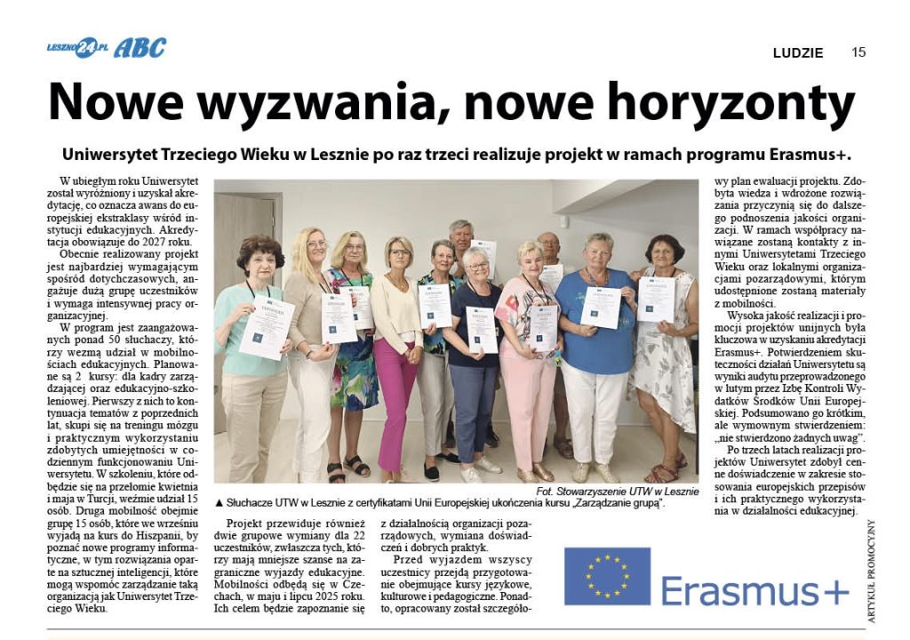 18.04.2025 r w gazecie ABC i na portalu Leszno24.pl ukazał się artykuł o realizacji projektów Erasmus+ przez nasz Uniwersytet Trzeciego Wieku.(kz)
