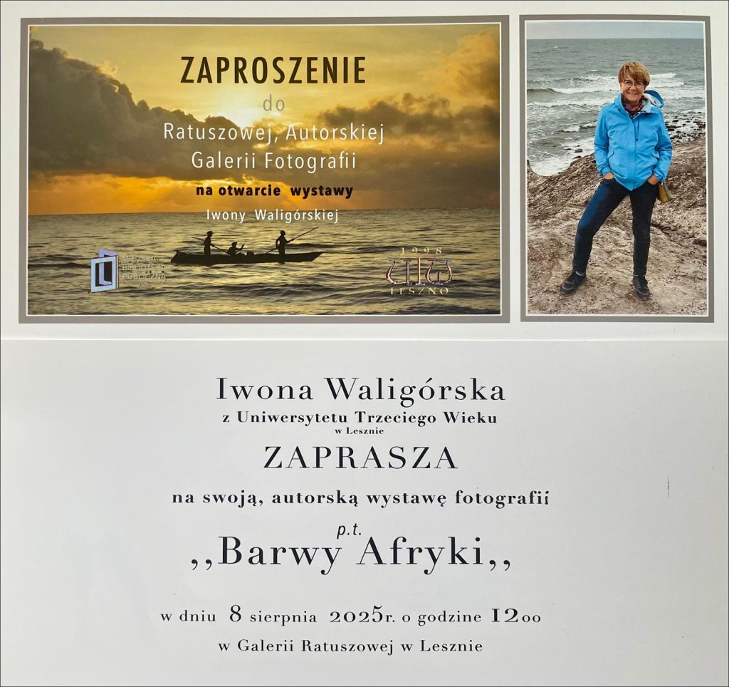 Sekcja fotograficzna Uniwersytetu Trzeciego Wieku w Lesznie serdecznie zaprasza na kolejny wernisaż indywidualnej, autorskiej wystawy fotografii Iwony Waligórskiej pt. „Barwy Afryki”. Uroczyste otwarcie wystawy odbędzie się 8 sierpnia 2025 r. o godz. 12:00, w Galerii Ratuszowej (II piętro) w Lesznie.