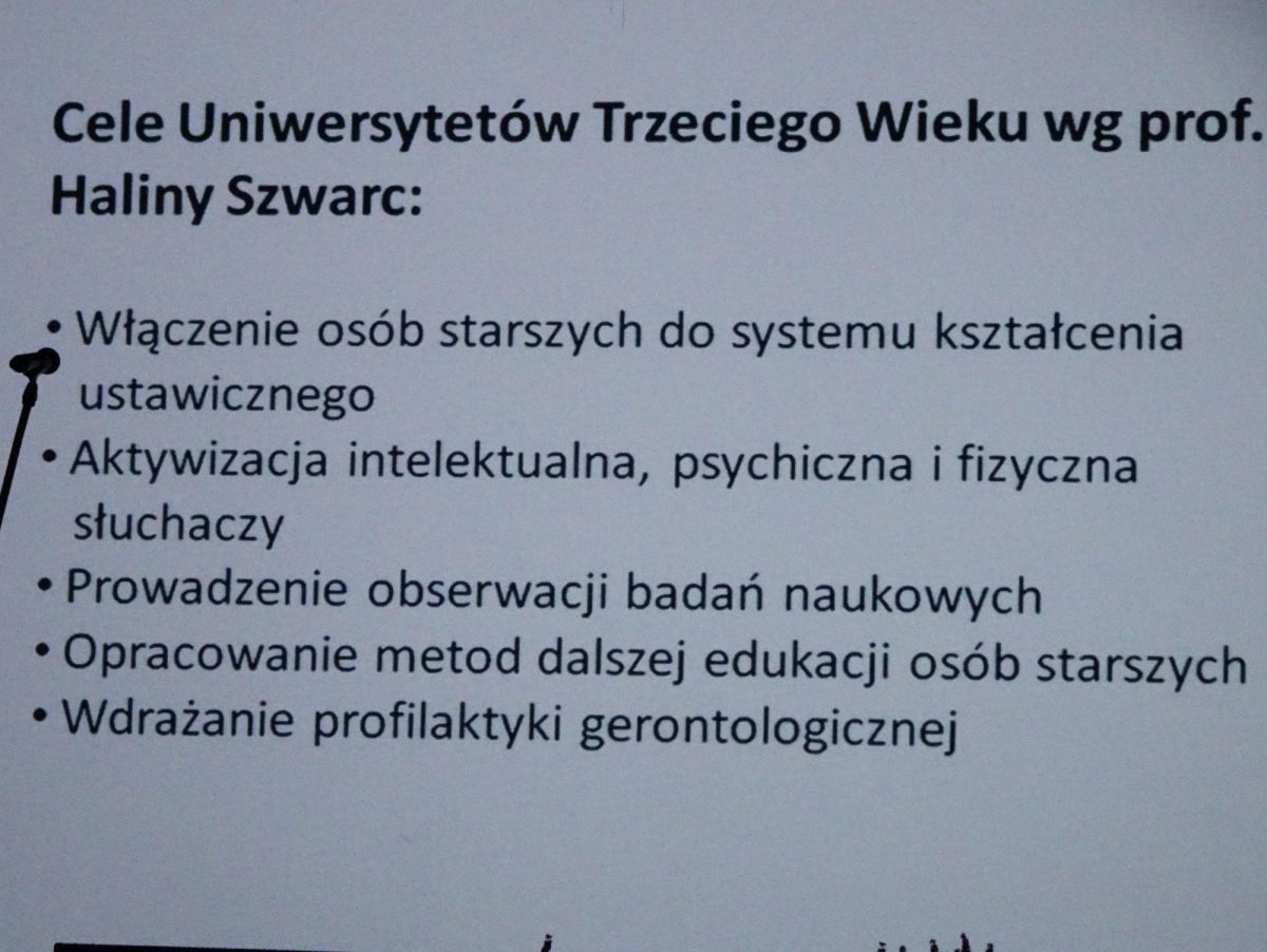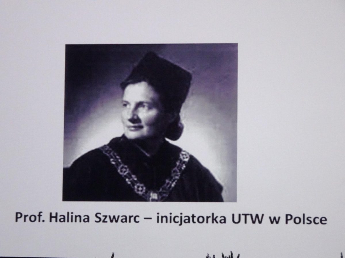 Życiorys założycielki – profesor Haliny Szwarc zaprezentowała koleżanka z naszego uniwersytetu – Mariola Pietek. Bogaty, a zarazem ciekawy życiorys pani profesor obfituje w ogromne zasługi dla kraju, zarówno w okresie II wojny światowej, kiedy była agentką wywiadu Armii Krajowej (Polska Mata Hari), jak i po wojnie, gdy jako prof. nauk medycznych zajmowała się procesami starzenia organizmu. Jej motto „by dodawać życia do lat, nie tylko lat do życia” jest realizowane przez UTW poprzez programy zajęć intelektualnych, aktywności fizycznej i społecznej. Szeroka oferta programowa leszczyńskiego UTW, którą przypomniała kol. Mariola Pietek, pozwala zaznaczyć jego obecność w Lesznie.