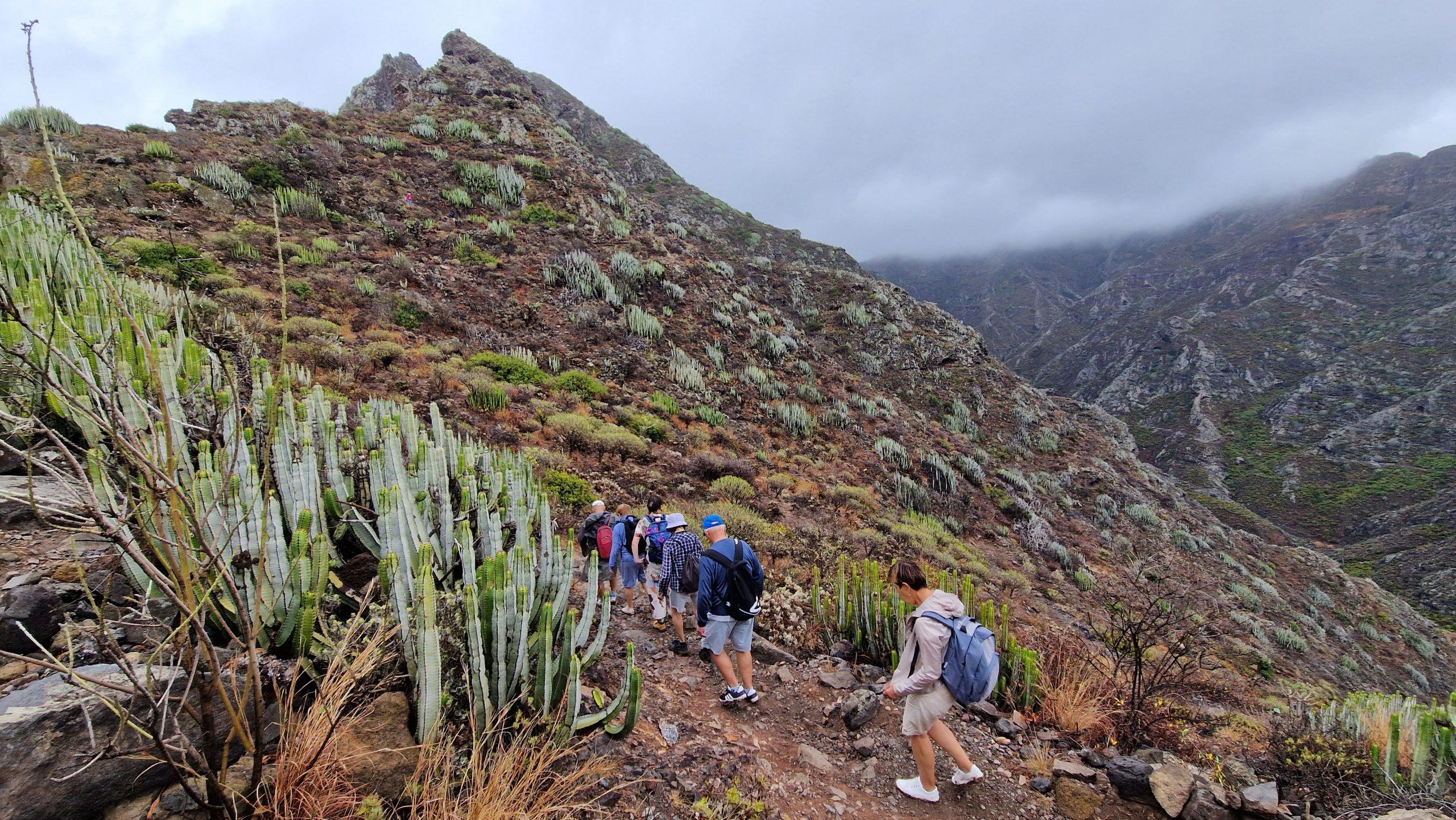 Pierwsza grupa, składająca się z dziewięciu osób wybrała się na Szlak Cruz del Carmen – Punta del Hidalgo wiodący z gór Anaga nad Ocean Atlantycki. Autobusem docieramy do Cruz del Carmen na wysokość blisko 1000 m n.p.m. Wyruszamy – niespokojni za sprawą chmur, które zawisły nad górami. Pierwsza część trasy to las wawrzynowy. Pada drobny deszcz, widoki ograniczone, nastroje takie sobie. Wreszcie docieramy do niewielkiej miejscowości Chinamada, gdzie wstępujemy do restauracji La Cueva. Tu pocieszamy się pyszną kawą, zupą wege i deserami. Deszcz nie ustępuje, ale wracamy na szlak. Trasa cały czas zawieszona jest nad górskim wąwozem, zbocza porasta niska roślinność. Niebo jaśnieje, w oddali widzimy ocean i zabudowę Punta del Hidalgo. W mgnieniu oka krajobraz zmienia się na iście marsjański: otaczają nas poszarpane czerwone skały. W końcu schodzimy do dna doliny…