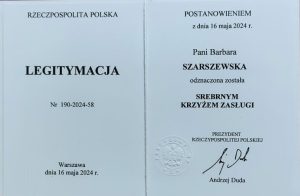 Srebrny Krzyż Zasługi przyznany 16 maja 2024 roku Barbarze Szarszewskiej przez Prezydenta Rzeczpospolitej Polskiej Andrzeja Dudę |