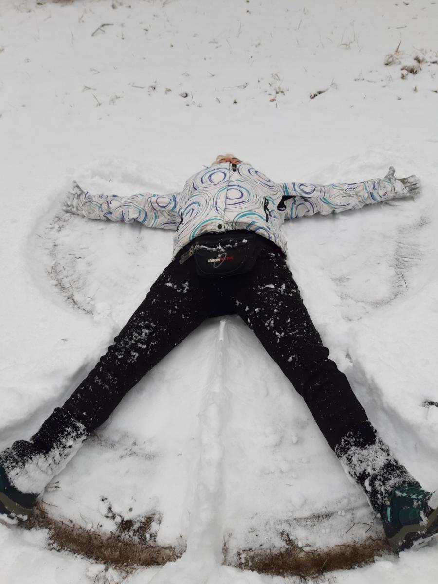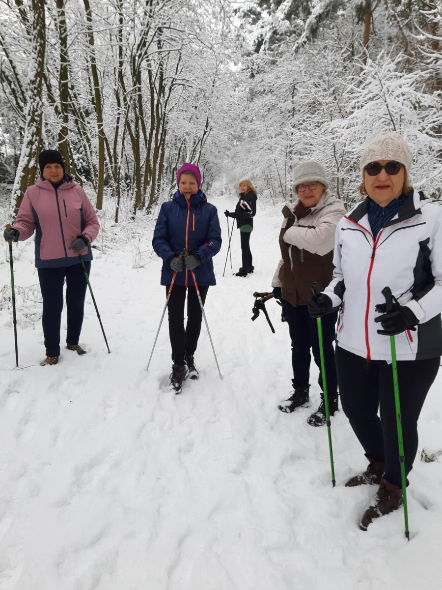Grupa WKU na zimowym spacerze z kijkami w bajkowej scenerii. Niektórym przypomniało się dzieciństwo i „robienie orła” na śniegu!
