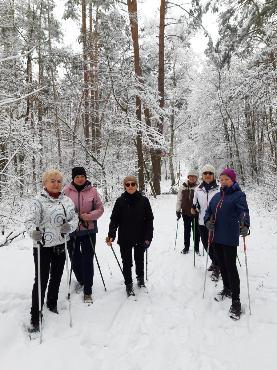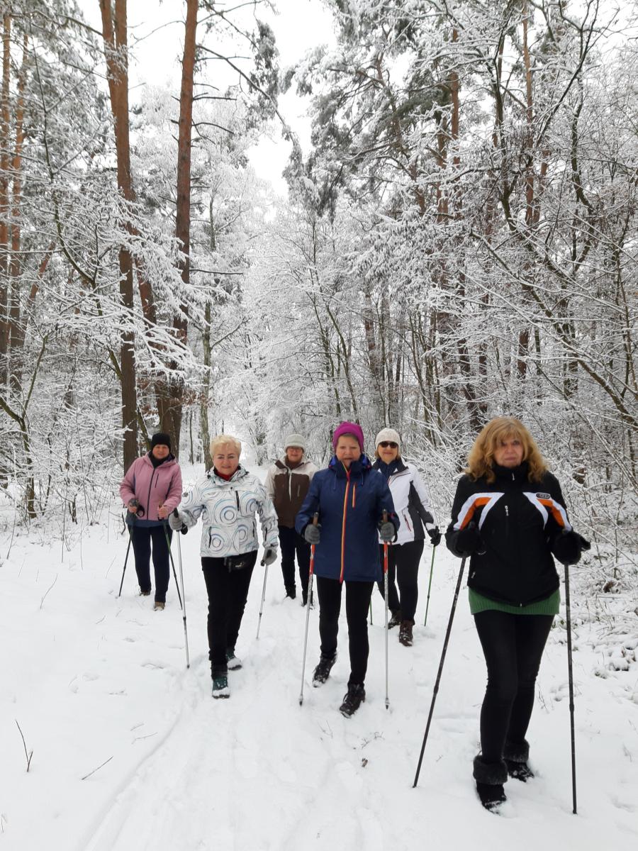 Grupa WKU na zimowym spacerze z kijkami w bajkowej scenerii