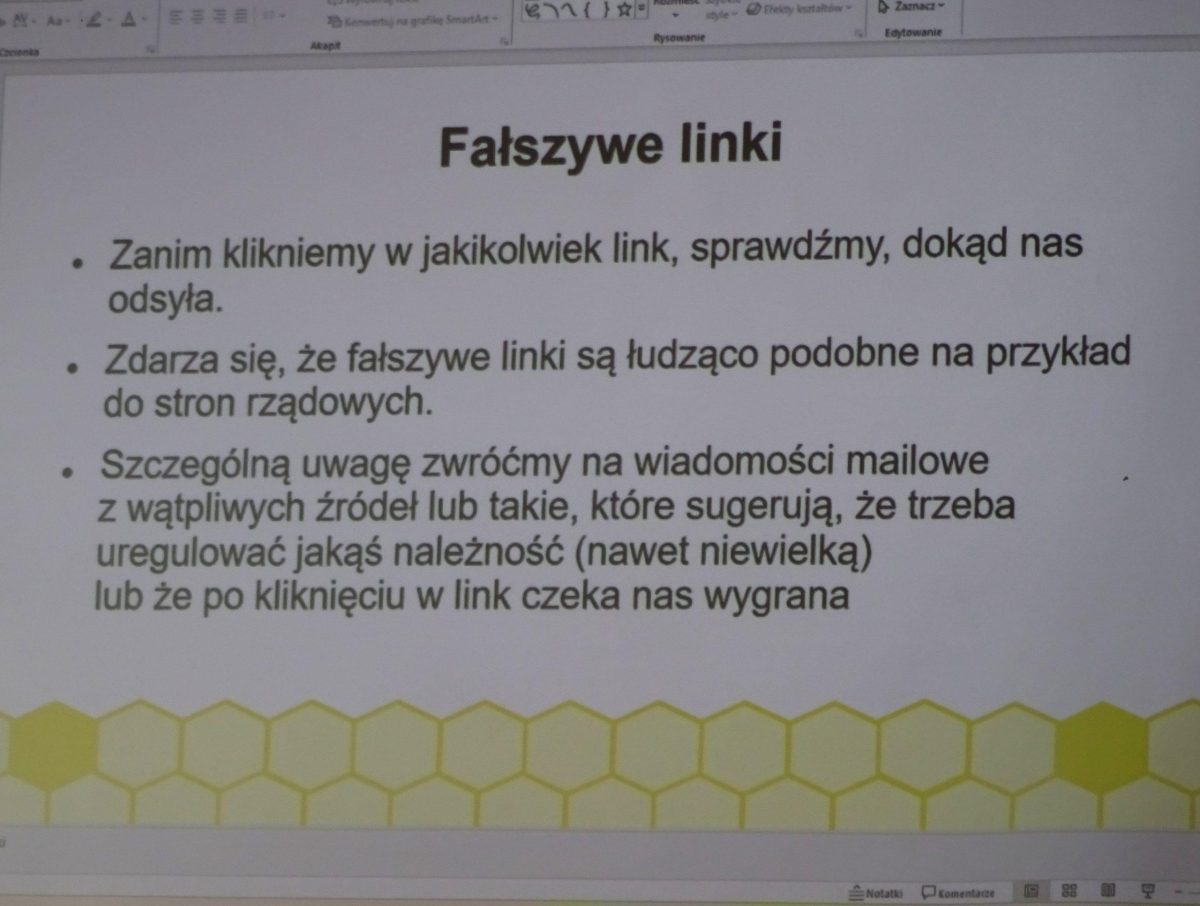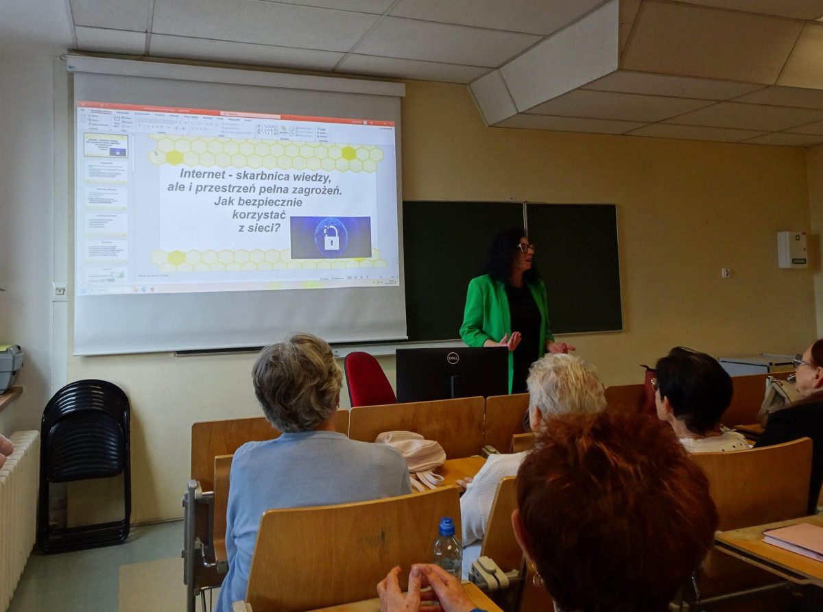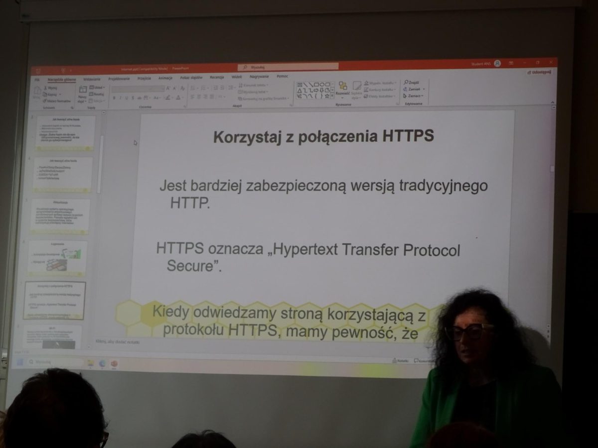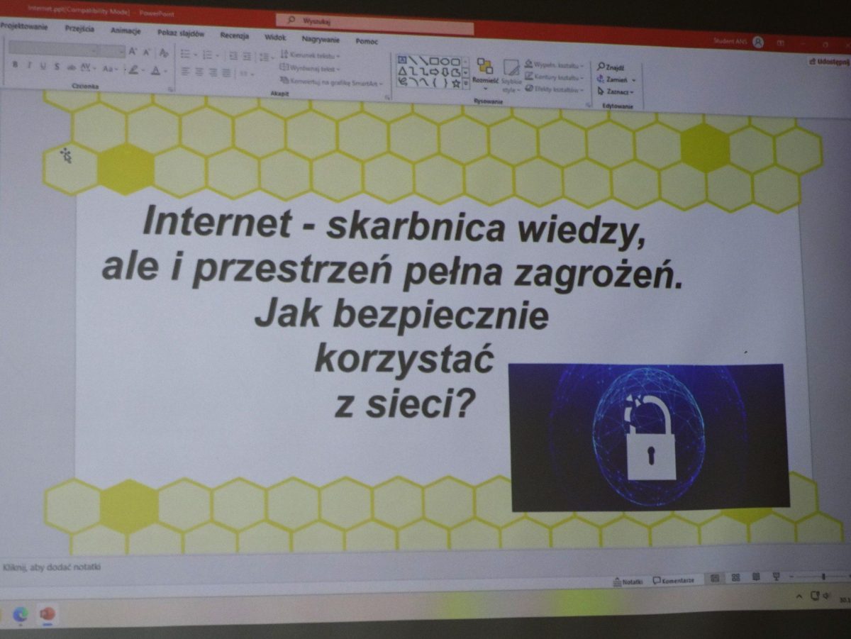 Prowadząca spotkanie Anna Maćkowiak na początku swojego wystąpienia mówiła o korzyściach, jakie daje umiejętne posługiwanie się siecią. Następnie przedstawiła najczęstsze zagrożenia, z którymi możemy mieć do czynienia podczas korzystania z internetu. Przytoczone przez nią przykłady z życia stanowiły dowód na to, że takie niebezpieczeństwa rzeczywiście istnieją.