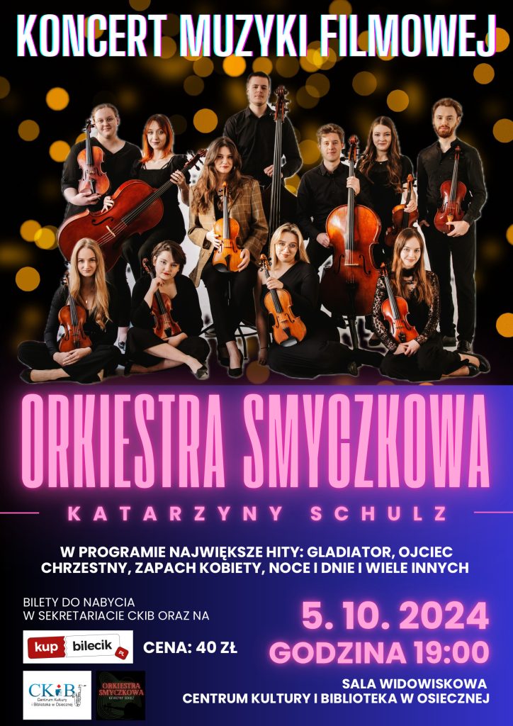 Centrum Kultury i Biblioteka w Osiecznej serdecznie zapraszają na wyjątkowy koncert muzyki filmowej w wykonaniu Orkiestry Smyczkowej Katarzyny Schulz. Wydarzenie odbędzie się 5 października 2024 roku o godzinie 19:00. To niepowtarzalna okazja, aby usłyszeć na żywo znane i lubiane utwory z największych produkcji filmowych w pięknych aranżacjach smyczkowych. Zapraszamy wszystkich miłośników muzyki na wieczór pełen niezapomnianych wrażeń!