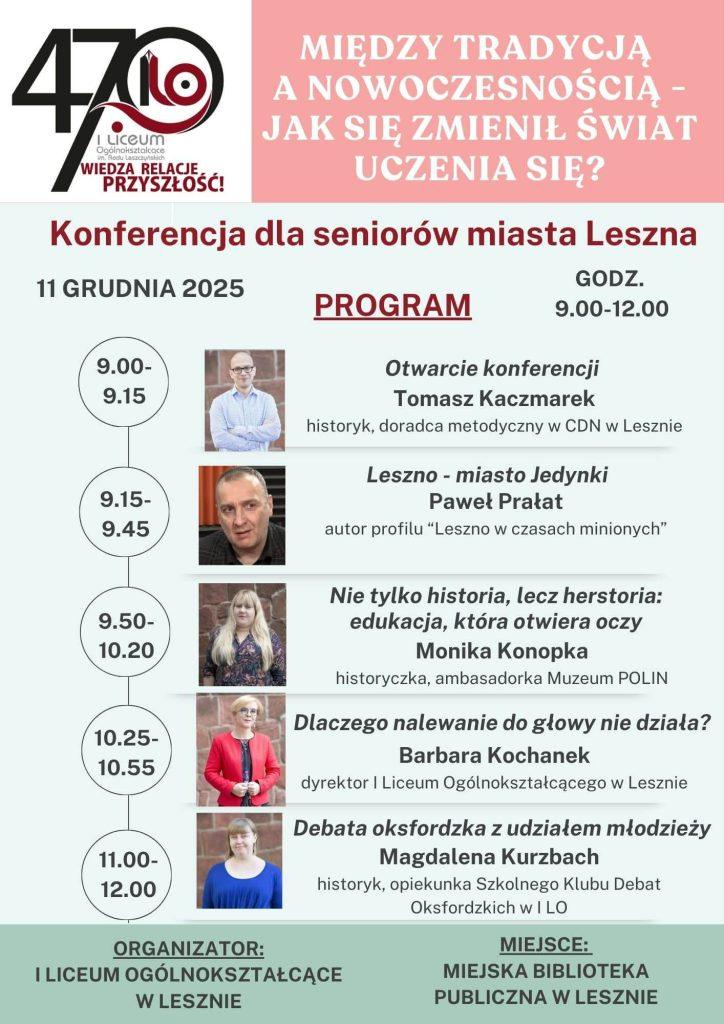I Liceum Ogólnokształcące w Lesznie świętuje 470 rocznicę swojego istnienia i z tej okazji zaprasza seniorów miasta Leszna na konferencję „Miedzy tradycją a nowoczesnością – jak się zmienił świat uczenia”.