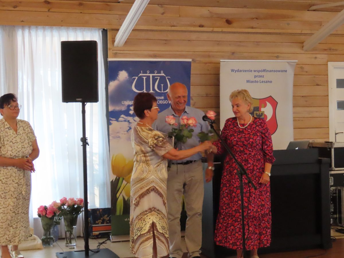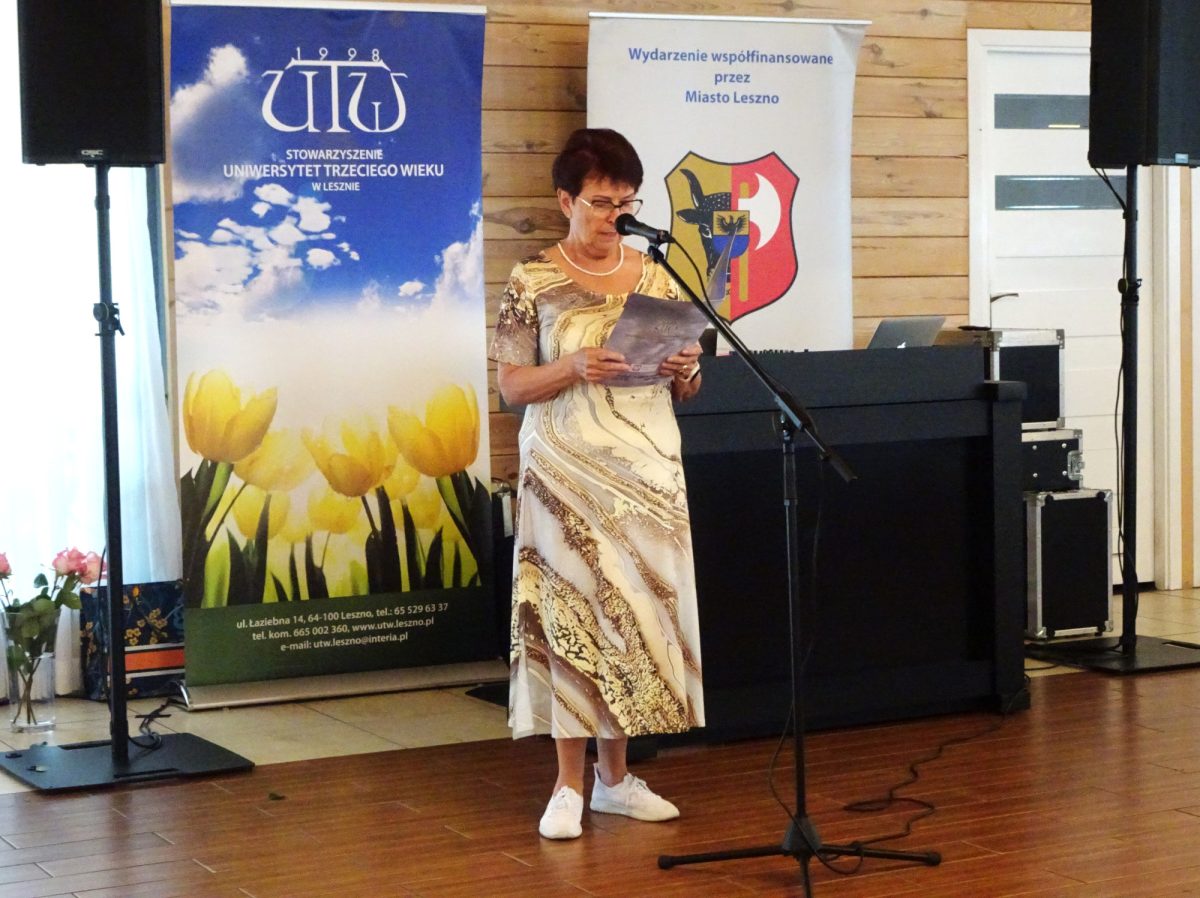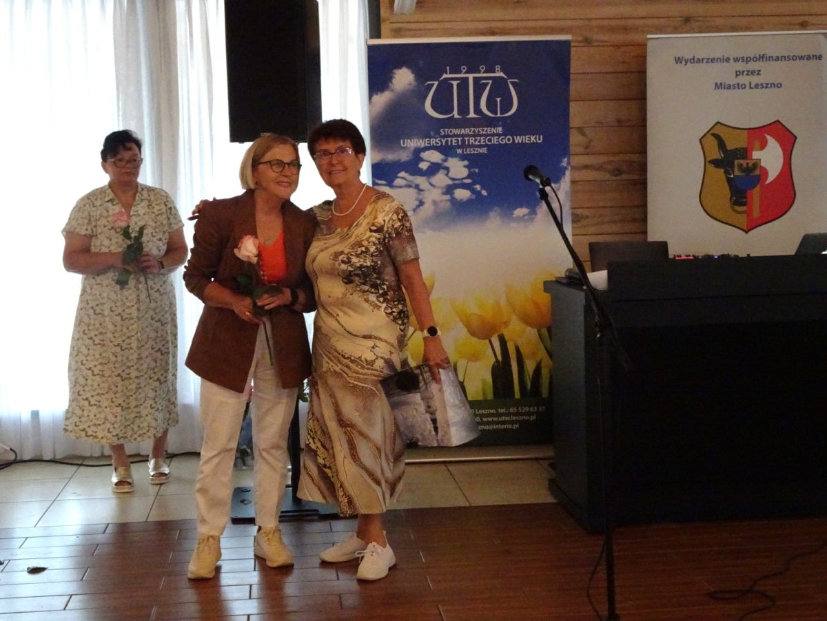 Uroczystość otworzyła wiceprezes zarządu, Barbara Szarszewska, która w serdecznym przemówieniu podziękowała wszystkim słuchaczom za „obecność, zaangażowanie i nieustanny głód wiedzy”. Wyrazy uznania przekazała członkom sekcji, dzięki aktywności i kreatywności których wszystkie sekcje naszego uniwersytetu tętnią życiem. Słowa szczególnej wdzięczności mówczyni skierowała do niezastąpionych wolontariuszy – za każdą godzinę poświęconą przez nich na przygotowanie wydarzeń i spotkań integracyjnych. Następnie przyszedł czas na wyróżnienia. Przede wszystkim zasłużyły na nie trzy członkinie naszego uniwersytetu, które nie opuściły żadnego wykładu. Są to: Krystyna Marszałek, Urszula Przezbór i Zdzisława Szpurek. Wyróżniono również zarząd za ciężką pracę wykonywaną w wolontariacie i Teresę Krawczyk „za pozyskiwanie pieniędzy na realizację zadań statutowych”, radę słuchaczy za „pomysły, kreatywność i gotowość do pomocy zarządowi”, a komisję rewizyjną za „czuwanie nad naszymi finansami”. Wszyscy wyróżnieni otrzymali jako gratyfikację kwiaty róży. Docenione zostały również administratorki strony internetowej za systematyczne i profesjonalne jej prowadzenie, członkowie sekcji rękodzieła, malarskiej i fotograficznej za kreatywność i piękne wernisaże, a pisarki z sekcji literackiej za niezmiernie ważne dla społeczności – nie tylko uniwersyteckiej – publikacje. Za przepiękne prezentacje w Klubie podróżnika podziękowania otrzymali ich twórcy, a uczestnicy olimpiad sportowych – za godne reprezentowanie naszej społeczności oraz zdobyte puchary, medale i sukcesy. Zaś wszyscy członkowie uniwersytetu otrzymali podziękowania za wspólnie spędzony rok – pełen nauki, aktywności i wzajemnej inspiracji. Potem scena należała do artystów. Zrobiło się naprawdę wesoło. Teatr przy stoliku wystąpił z programem satyrycznym. Artyści z ogromnym dystansem i humorem przypomnieli nam, że szkoła – niezależnie od wieku – potrafi być źródłem nie tylko wiedzy, ale i anegdot. W dalszej części spotkania sceną zawładnęły taniec i muzyka. Grupa taneczna zaprezentowała się z gracją i pasją w dwóch tańcach: były to zmysłowa bachata do utworu „California Blue” i taniec westernowy na podstawie songu „Cotton Eye Joe”. Chór wystąpił z refleksyjnymi piosenkami „Marianno” i „Zabrałeś serce moje”, a zespół zumby porwał wszystkich swoją energią, odtwarzając w przygotowanym programie elementy tańca kowbojskiego (zresztą w adekwatnych do rodzaju muzyki strojach) oraz tańca latino do utworu „Calma”. Finałem spotkania był poczęstunek i tańce już dla wszystkich. Kto tylko miał ochotę, dołączył.