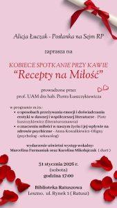 Alicja Łuczak – Posłanka na Sejm RP, zaprasza mieszkanki Leszna i okolic na niezwykłe wydarzenie z cyklu „Kobiece spotkanie przy kawie”. Już w najbliższą sobotę w Bibliotece Ratuszowej o miłości porozmawiają eksperci ze świata nauki i psychologii.