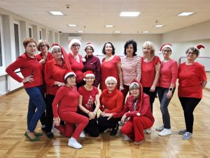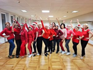 Podczas zajęć tanecznych odwiedził nas Święty Mikołaj! Aby umilić mu wizytę, wszystkie ubrałyśmy się na czerwono. Na pamiątkę zrobiłyśmy sobie wspólne zdjęcia – choć sam Mikołaj pozostał na nich niewidoczny. Zapewniamy jednak, że ćwiczył z nami układy taneczne!😊