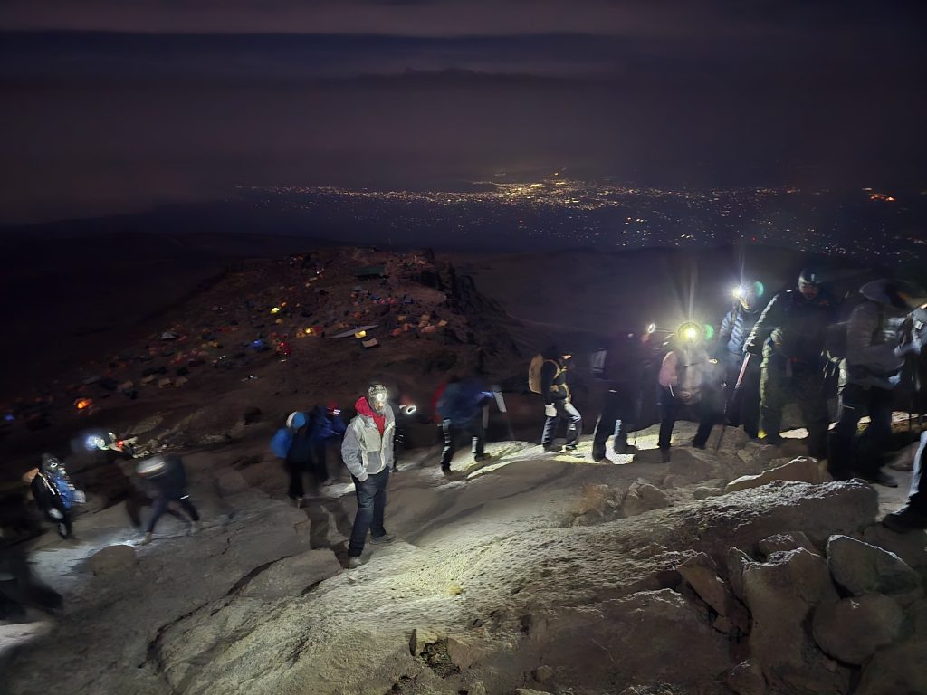 Z obozu Barafu, po przerwaniu odpoczynku, zaczęliśmy o północy ostateczny atak na szczyt. Noc była ciemna, rozświetlona naszymi latarkami-czołówkami, wypełniona zmęczonymi oddechami. Szybkość spadła nam do minimum, a każdy krok wymagał maksymalnego skupienia. Z każdym metrem czuło się zwiększającą wysokość, a rozrzedzenie powietrza było coraz bardziej odczuwalnie.
