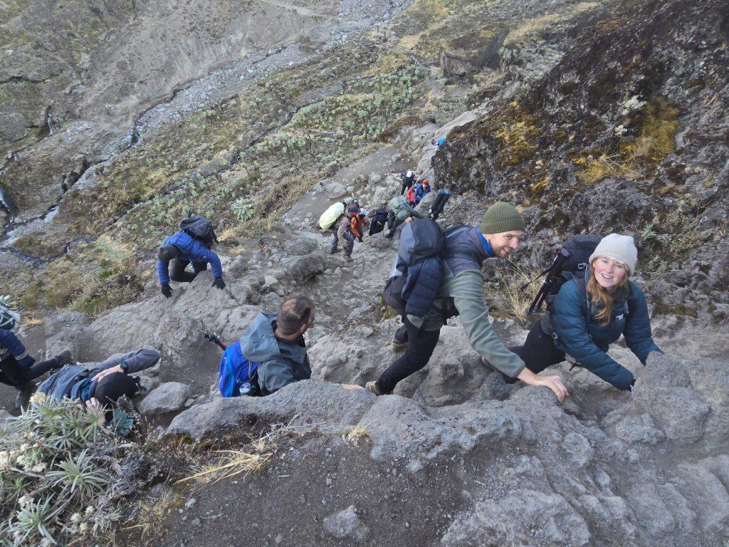 Wielki moment tej części wspinaczki to Barranco Wall – stroma ściana skalna, którą trzeba pokonać, aby móc się wydostać z obozu. Wysiłek był ogromny, ale satysfakcja po dotarciu na górę – bezcenna. Stamtąd ruszyliśmy dalej, w stronę obozu Karanga, otoczeni księżycowym krajobrazem i coraz bardziej rozszerzającym się i widocznym szczytem.