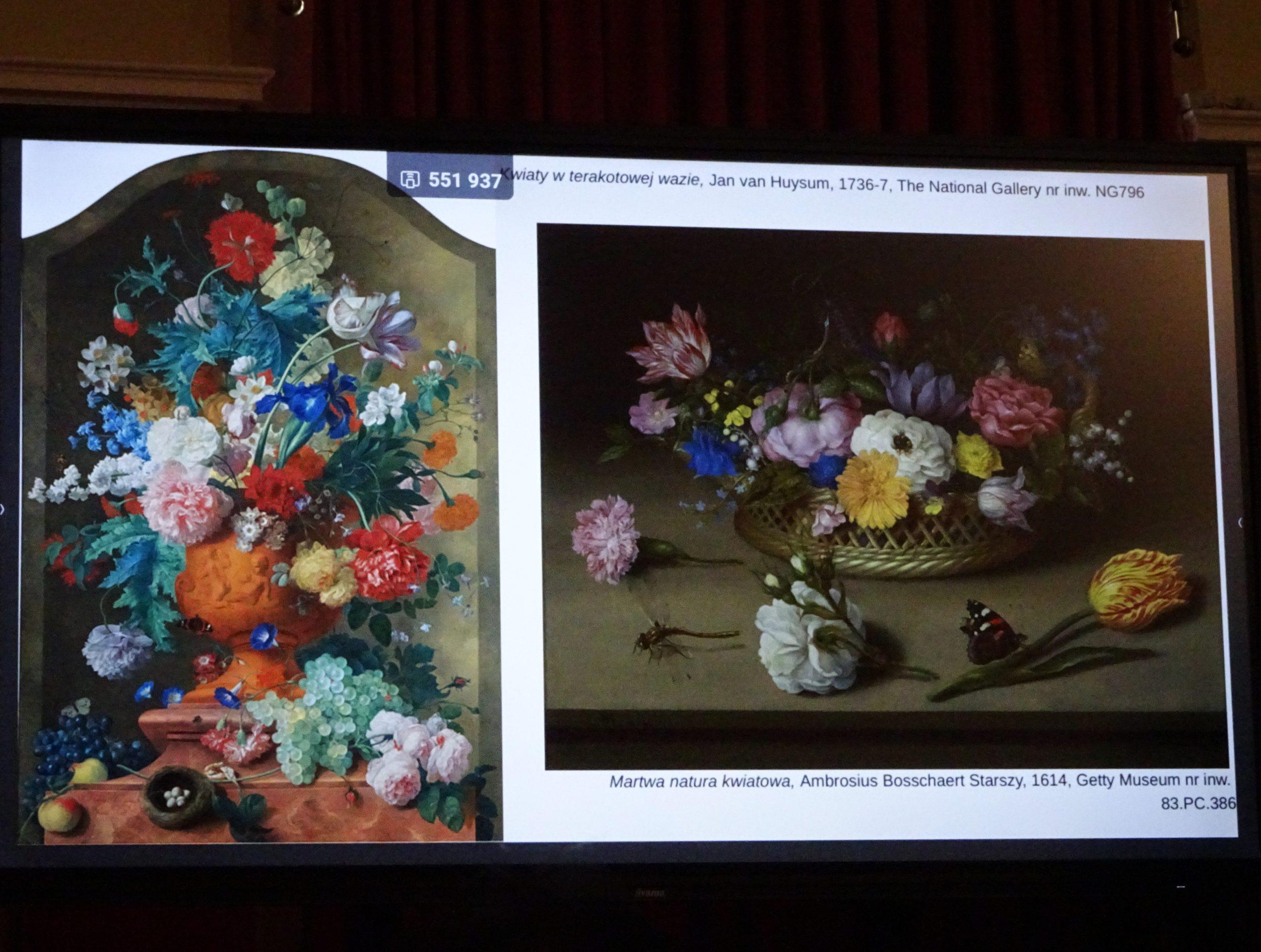 Muzealny wykład, który odbył się 23.04.2026 r., przeprowadzony przez Zuzannę Rybińską, był kontynuacją wcześniejszej prelekcji o „Motywach roślinnych w sztuce”. Tym razem była mowa o malarstwie w wiekach od XVII do końca XIX. Martwe natury szczególnie zakorzeniły się w sztuce regionu na północ od Alp. W okresie baroku kwiaty stały się, zgodnie z panującą wówczas ideologią, symbolem przemijania życia i marności dóbr doczesnych. W malarstwie niderlandzkim wręcz obsesyjnie odwzorowywano tulipany. Związane to było z panującą wówczas tulipomanią. Ten przybyły do Europy kwiat osiągał wówczas niebotyczne ceny; 1cebulka miała wartość, np. ośmiu tłustych świń, czterech beczek piwa, czy 454 kg sera (te informacje pochodzą ze źródła przedstawionego przez prelegentkę). W omawianych epokach motywy roślinne występowały jako główny temat albo jako motyw towarzyszący, niejednokrotnie też symbolizowały ukryte treści. Spotkanie, wzbogacone prezentacją ilustracji, pozwoliło na przedstawienie w niezwykle interesujący sposób roślin jako źródła inspiracji dla artystów na przestrzeni wieków.