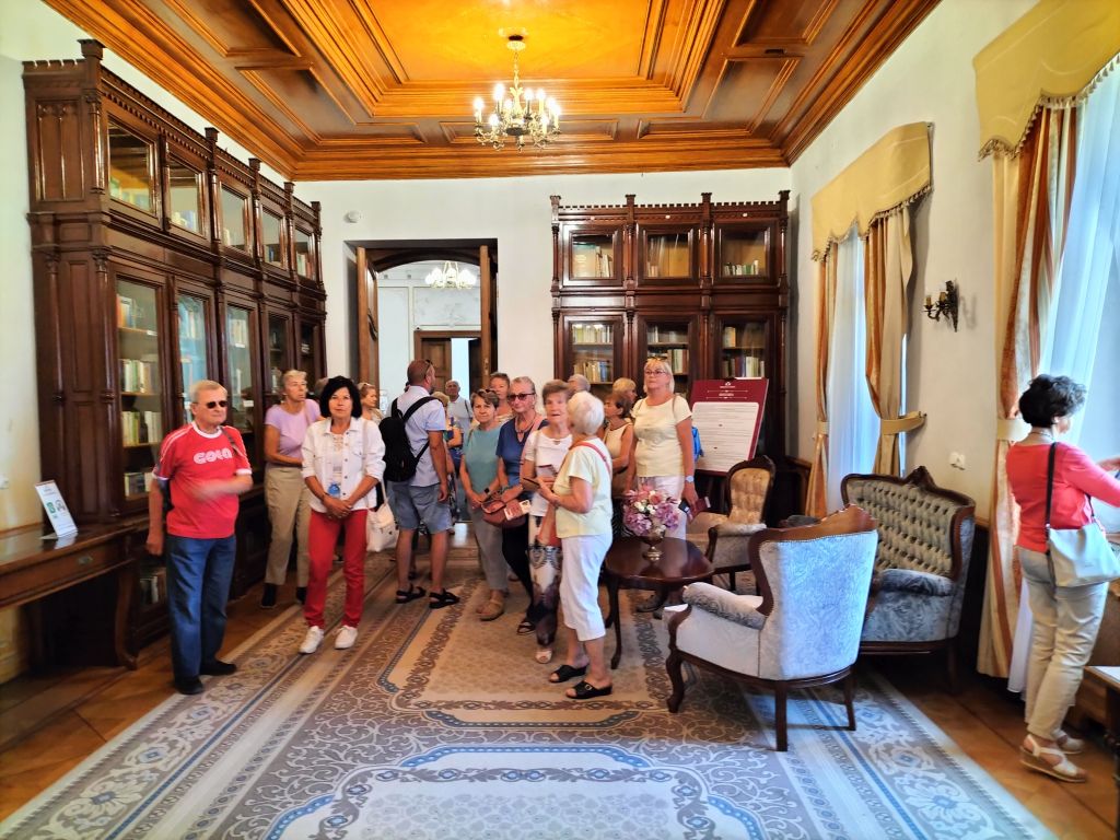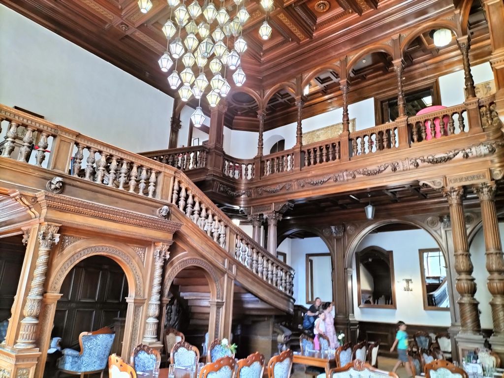 Przed nami wielki zamek, zamek z bajki , jakby przeniesiony z filmów Disneya. Mnóstwo tu wież, wieżyczek, balkonów, tarasów, zdobień. W tym zamku zatrzymujemy się na nocleg. Pobyt w nim zaczynamy od posiłku podanego w Sali z kominkiem. Drewniane, rzeźbione schody prowadzą z tej Sali do reprezentacyjnych komnat zamku: balowej, lustrzanej, biblioteki, gabinetu dawnego właściciela, prywatnych apartamentów. W bocznej części zamku urządzone są pokoje hotelowe, w których odpoczywamy.