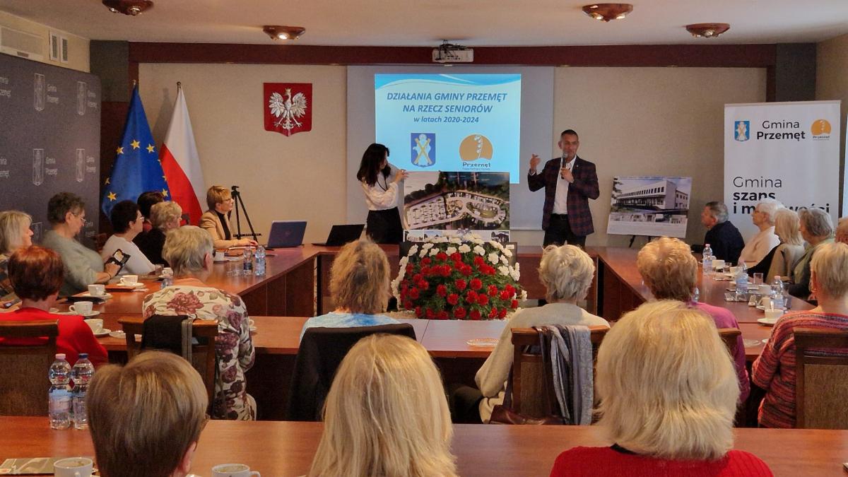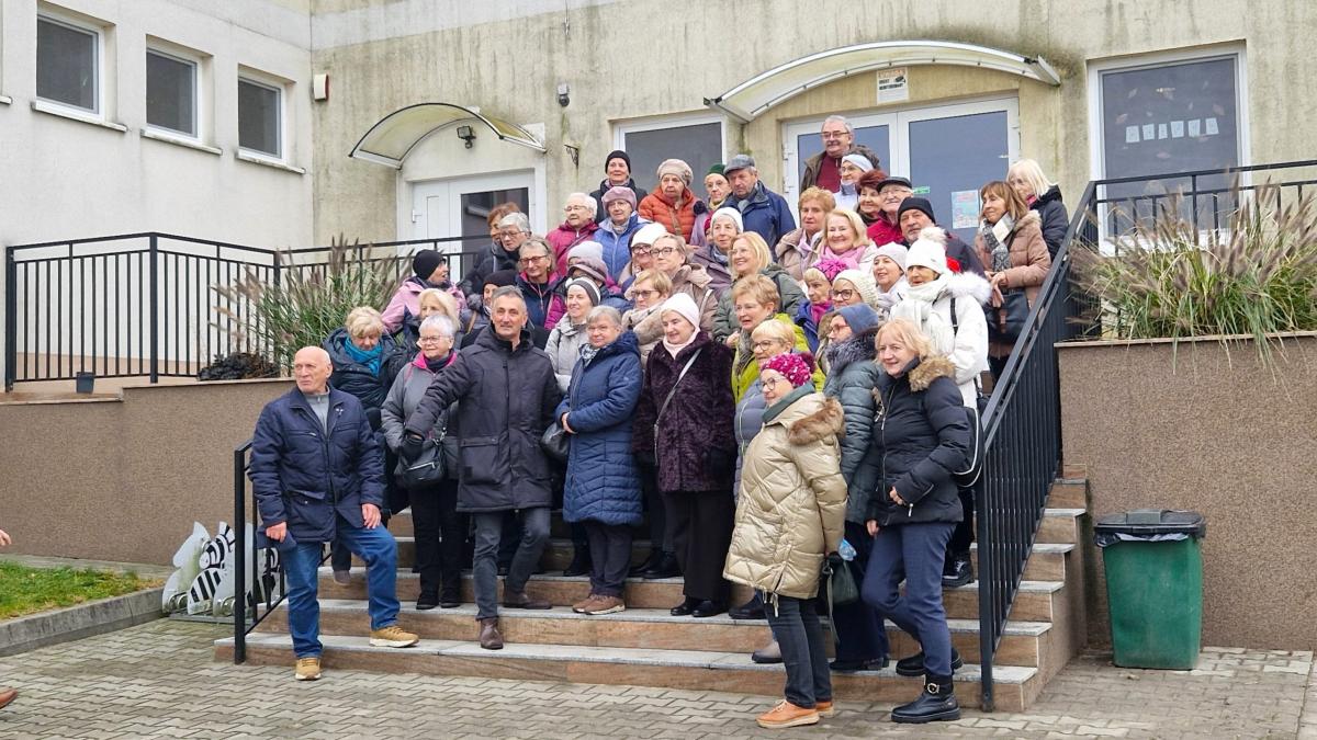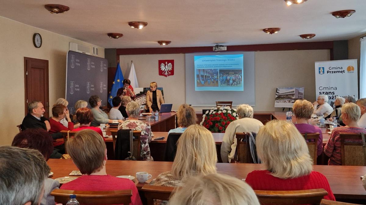 I tak 22 listopada 2024r. pojawiliśmy się w Urzędzie Gminy w Przemęcie, w którym przyjęli nas włodarze gminy – wójt Janusz Frąckowiak, kierowniczka oddziału oświaty i promocji Patrycja Pabich, pracownicy urzędu oraz zaproszeni goście. Spotkanie rozpoczęło się od poczęstunku, na którym, oprócz zwyczajowej kawy z ciastem, degustowaliśmy wędliny pochodzące z lokalnej wytwórni Słomiński. Zresztą właściciele firmy na zakończenie pobytu obdarowali każdego z nas słoikiem pasztetu z kaczką i morelami. W tym czasie wyświetlono filmy, z których jeden ukazywał to, z czego słynie gmina, czym zajmują się jej mieszkańcy, jakie są ich osiągnięcia, i w jaki sposób kontynuowane są tradycje. Drugi zaś pokazywał inwestycje dotyczące przede wszystkim szeroko pojętego bezpieczeństwa, turystyki i kultury. Następnie wójt przedstawił gminę jako miejsce szans i możliwości. Mówiąc o historii tych ziem, podkreślił ich długą historię (od XIII w.), rolę cystersów w rozwoju ekonomicznym oraz ogromny patriotyzm okolicznych mieszkańców. Gospodarka tych terenów opiera się przede wszystkim na dochodach z turystyki i rolnictwa indywidualnego. Zasoby przyrodnicze ziemi przemęckiej to przepiękne lasy i malownicze jeziora, z których część leży na terenie Przemęckiego Parku Krajobrazowego. To one stanowią o bogatej ofercie turystycznej i agroturystycznej. Związana jest z tym sztandarowa inwestycja – budowa parku kamperowego wraz z infrastrukturą towarzyszącą w Osłoninie. Jedna z niewielu w Polsce. Rolniczym symbolem tego terenu są szparagi. Ich uprawa stawia ten obszar w krajowej czołówce. W gminie dba się o każdego człowieka, toteż działania Gminnego Ośrodka Pomocy Społecznej, o których mówiła jego dyrektor, obejmują również seniorów. Oprócz rozmaitych przedsięwzięć na rzecz ludzi starszych, wymieniła również powstanie Uniwersytetu Trzeciego Wieku, do czego przyczyniła się także, służąc radą, prezes naszego UTW, Maria Zielony.