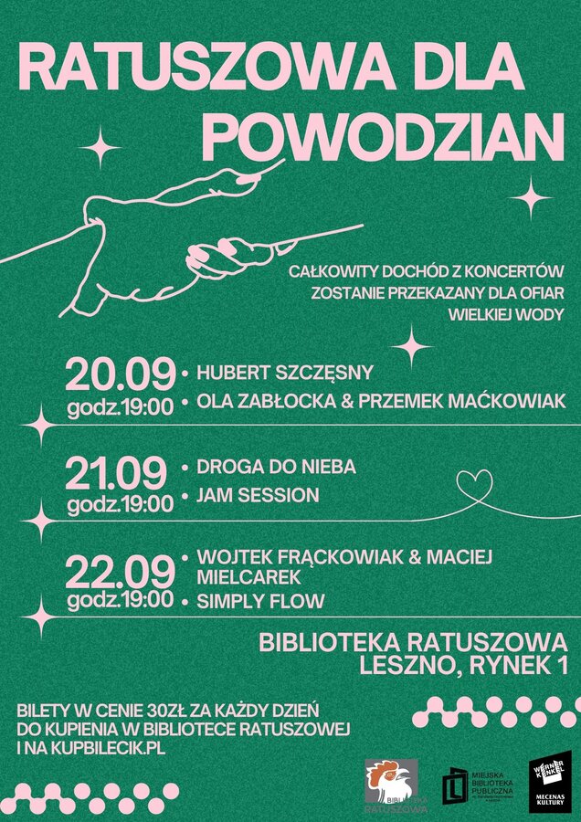 Nadszedł czas pomagania! Hubert Szczęsny, Ola Zabłocka i Przemek Maćkowiak, Droga do Nieba, Wojtek Frąckowiak i Maciej Mielcarek oraz Simply Flow – wszyscy oni już w ten weekend zagrają w cyklu koncertów charytatywnych ,,Ratuszowa dla powodzian”! Spotykamy się codziennie – w piątek, sobotę i niedzielę o 19:00. Całkowity dochód z koncertów zostanie przekazany na pomoc ofiarom wielkiej wody 2024. ,,Nic naprawdę nic nie pomoże/ Jeśli Ty nie pomożesz dziś miłości”. Bilety (30 zł za każdy wieczór) do kupienia w Bibliotece Ratuszowej i na kupbilecik.pl.