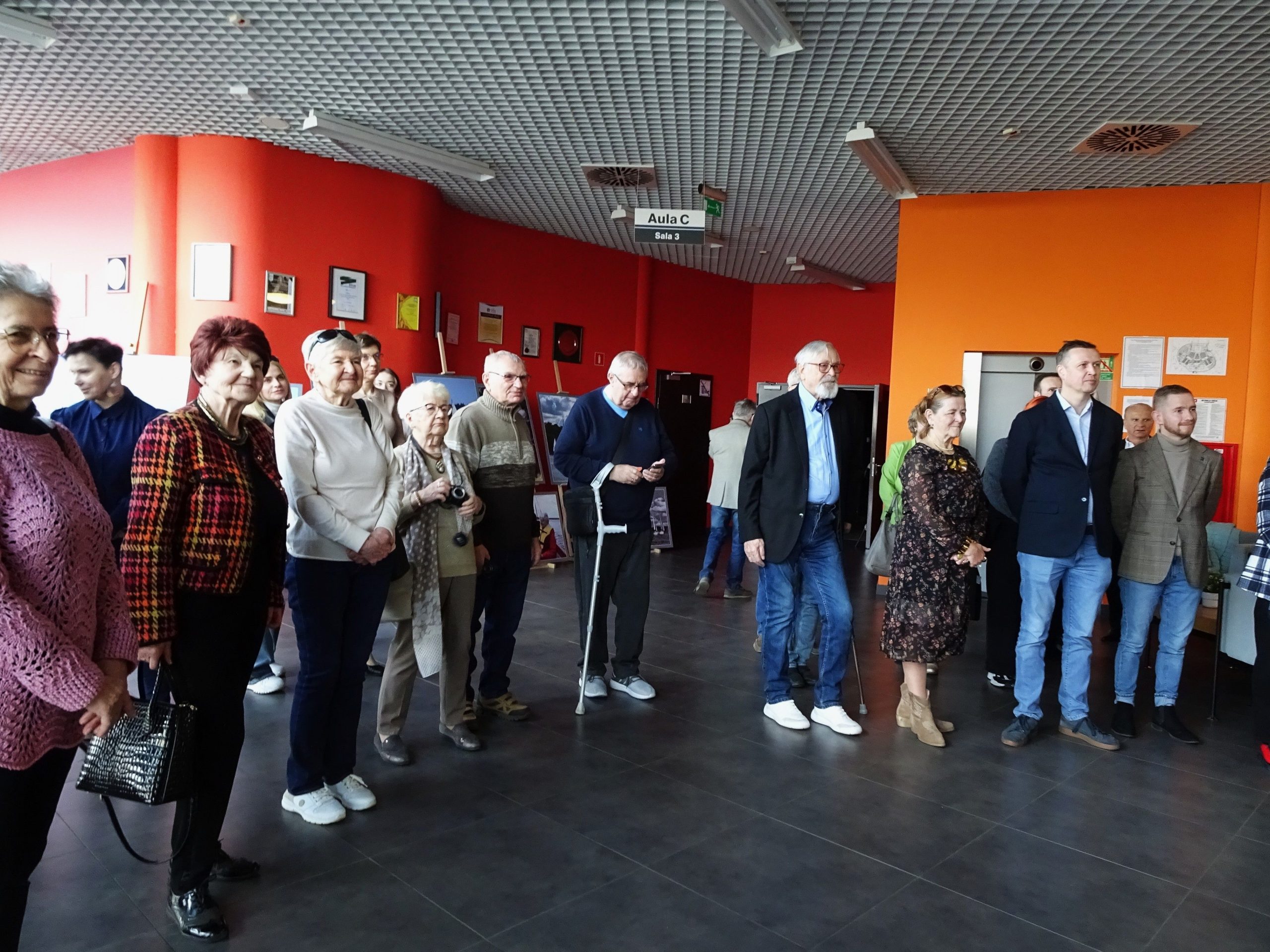 Przybyło liczne grono zaproszonych gości oraz słuchacze naszego UTW i oczywiście członkowie sekcji fotograficznej. Byli również studenci uczelni. Niestety, prowadzący sekcję fotograficzną Ryszard Cienki z powodu choroby nie mógł wziąć udziału w tej uroczystości, więc honory gospodarza pełnił starosta sekcji Tadeusz Kin. Wśród zaproszonych gości byli z ramienia ANS prorektor dr Dorota Sipińska i kanclerz mgr Andrzej Szwarczyński. Przybyli również naczelnik Wydziału Kultury i Sportu Marcin Kochowicz i dyrektor Miejskiego Domu Kultury Grzegorz Herman oraz prezes naszego uniwersytetu Maria Zielony. Byli również leszczyńscy żeglarze 60+ – uczestnicy fotografowanych regat. Po powitaniu przybyłych gości i formalnym otwarciu wystawy, członkowie sekcji fotograficznej otrzymali pamiątkowe dyplomy, a następnie organizatorzy zaprosili gości do obejrzenia zgromadzonych fotografii.