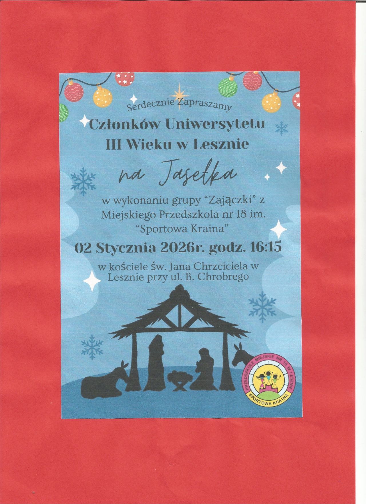 Mamy przyjemność zaprosić wszystkich członków Uniwersytetu Trzeciego Wieku w Lesznie na wyjątkowe widowisko. Grupa „Zajączki” z Miejskiego Przedszkola nr 18 przygotowała tradycyjne jasełka.