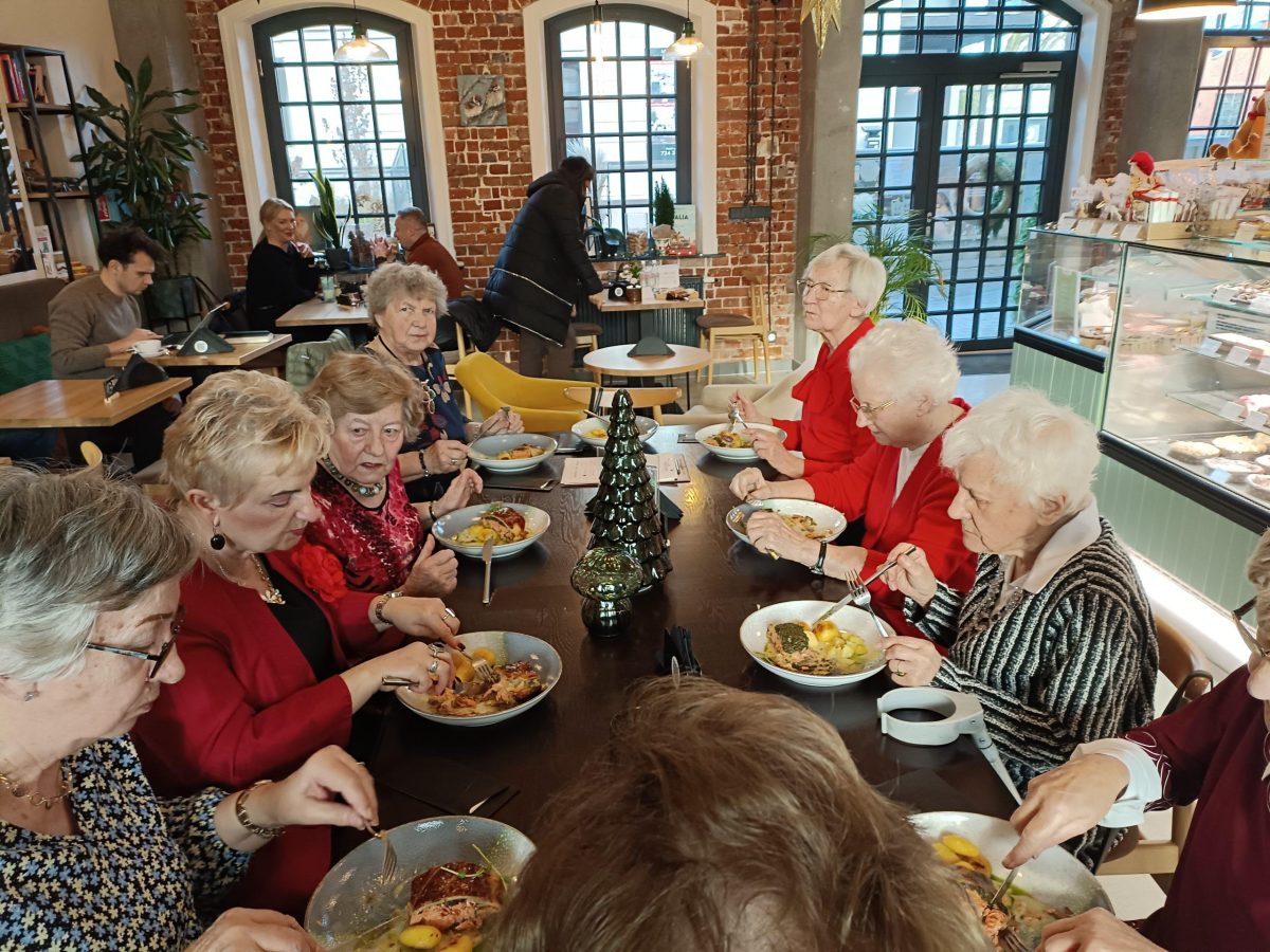 W tym roku spotkałyśmy się 10 grudnia o godz. 12 – tej na zamówionym przyjęciu z menu wigilijnym w Cukierni Nowaczyńskiego. Było nas 10 osób – atmosfera była świąteczna – wiele wspomnień, żartów, minęło tyle lat, przystąpiły nowe koleżanki – Krystynka, Irenka, Majka (są z nami już kilka lat). Życzenia rozpoczęłyśmy od naszych najstarszych koleżanek – Izy i Marysi (91 lat!), życzyłyśmy sobie przede wszystkim dobrego zdrowia, pogody ducha, sił na przetrwanie wszystkich dolegliwości. Typowe menu wigilijne zadowoliło nas bardzo – zupa grzybowa, łosoś w cieście w sosie cytrynowym z rewelacyjnymi kulkami ziemniaczków. Potem kawa czy herbata urodzinowo-imieninowa Ewy. Dla każdej uczestniczki były drobne słodkie upominki od Ewy, od Iwony z życzeniami dla grzecznych „dzieci” od Mikołaja. Do naszej najstarszej koleżanki Joasi (97 lat) wybrałyśmy się ze starościną Wacławą z życzeniami do domu. Bardzo się cieszyła i też przekazywała koleżankom życzenia.