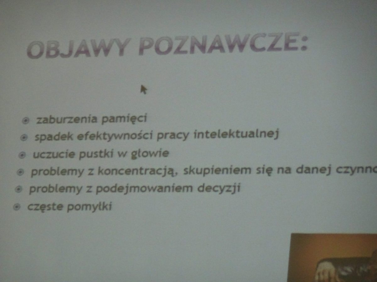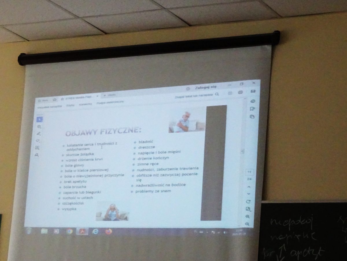 Część wykładu miała charakter warsztatowy – uczestnicy aktywnie włączali się w zajęcia, odpowiadając na pytania prowadzącej, m.in. dotyczące przyczyn i objawów stresu.