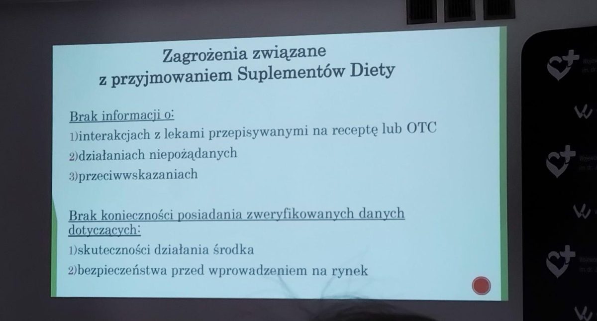 W poniedziałek 30.03.2026 gościliśmy w Wojewódzkim Szpitalu Wielospecjalistycznym, gdzie wysłuchaliśmy wykładu pt. „Bezpieczne leki dla seniorów”. Temat przedstawiła pani Justyna Staducka – kierownik apteki szpitalnej. W prezentacji omawiane były te leki, które są na receptę i te, które można kupić bez recepty. Okazuje się, że mieć leki to jedna sprawa, ale druga sprawa to jest sposób przyjmowania tych preparatów i o tym właśnie była mowa w wykładzie. Pani Justyna mówiła również o preparatach zwanych suplementami diety. Obecnie jest ich bardzo dużo i są dostępne prawie w każdym sklepie, nie tylko w aptece. Nie ma dnia, a nawet godziny, żeby w radiu czy telewizji nie było reklamy temat leków i suplementów diety. W reklamie te preparaty działają cuda, to dlaczego sobie nie kupić? Dzięki prezentacji pani Justyny wiemy, że dużo to nie znaczy dobrze, a raczej trzeba się zastanowić, ile i co bierzemy.