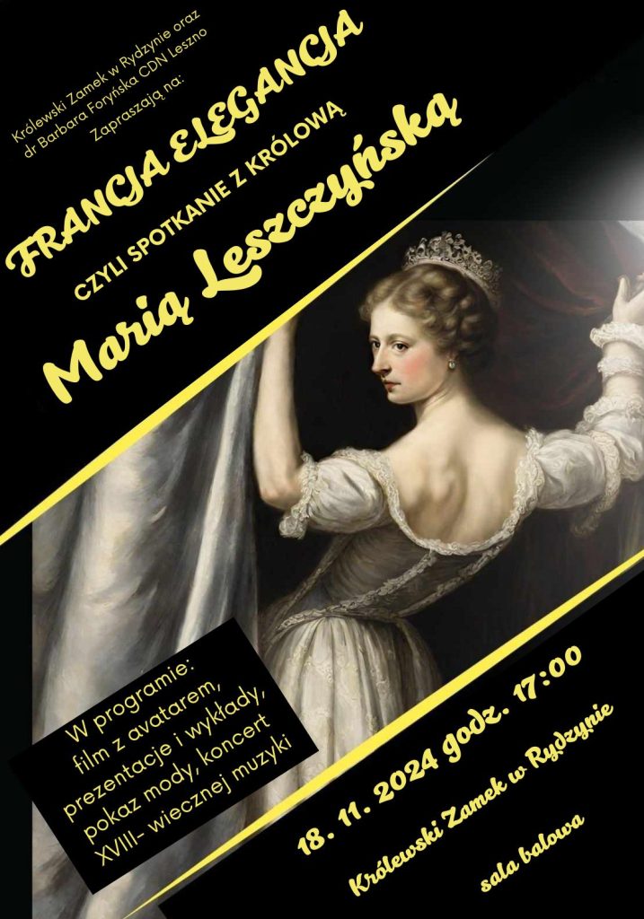 Podczas spotkanie zostanie wyświetlony film z avatarem pt; „Francja elegancja czyli spotkanie z królową Marią Leszczyńską ” . Bedą: prezentacja, wykłady, pokaz mody oraz koncert muzyki XVIII wiecznej. (hr)