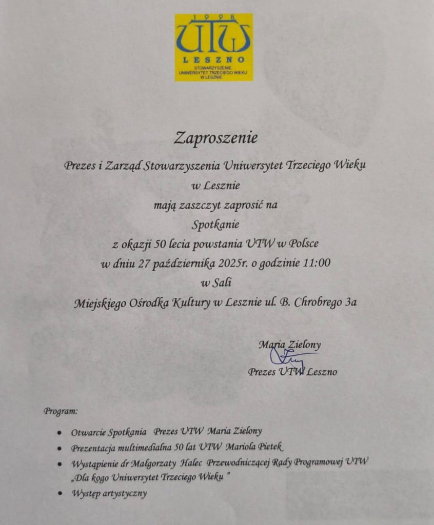 W poniedziałek, 27 października 2025 roku o godzinie 11:00, w sali Miejskiego Ośrodka Kultury w Lesznie odbędzie się uroczyste spotkanie z okazji 50-lecia powstania Uniwersytetów Trzeciego Wieku w Polsce. Wydarzenie będzie okazją do wspólnego świętowania, wspomnień i rozmów o przyszłości ruchu uniwersytetów senioralnych.